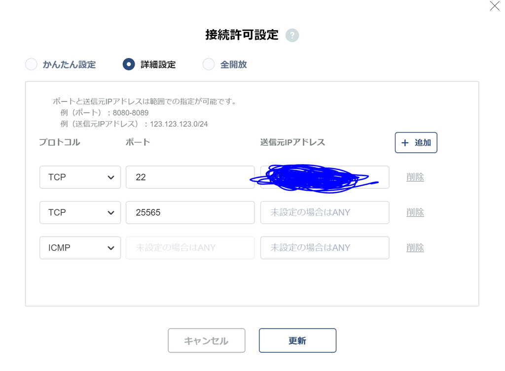 例えば、この状態で22(ssh)を設定すると、全世界どこからでも ssh で接続が可能になり、アクセス制御を行うことが難しくなります。加えて minecraft のポートも許可する場合、コントロールパネルでは全開放を選択し、ufw, firewalld, iptables などで ssh, minecraft のポートの通信許可しそれ以外をdropする設定が必要でした。