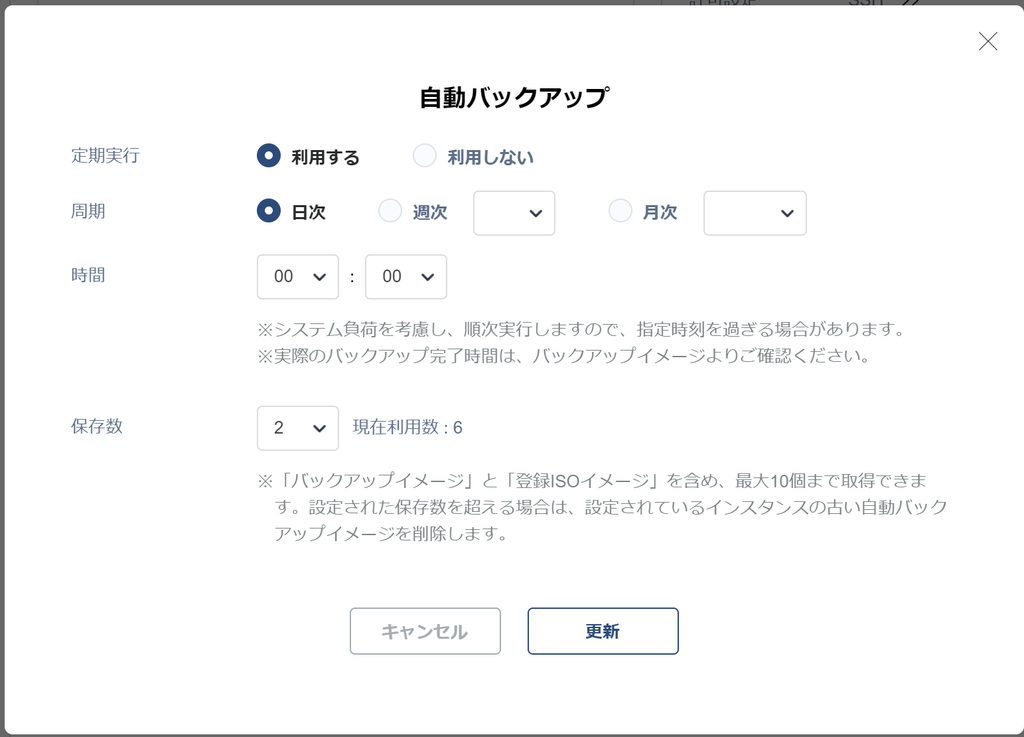 自動バックアップ機能は一定期間毎にインスタンスのバックアップを取ってくれる機能になります。