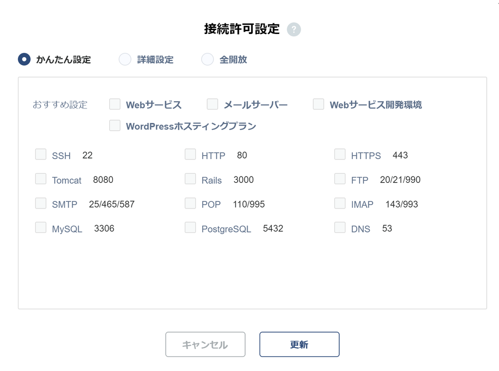 ポートと通信許可するIPアドレスを設定することで必要なポートのみを簡単に利用することが可能になります。